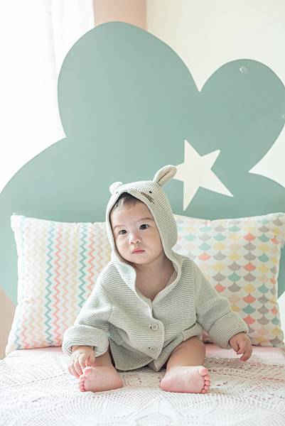 去年在MigaStudio 拍了孕婦寫真,拍照成果還不錯,所以就訂了寶寶的周歲寫真,終於等到饅嘟10個月大,可以去拍寫真囉。在韓國通常都會幫寶寶辦周歲宴,這時需要很多寶寶的照片,所以韓國寶寶的周歲寫真大都是提早拍,才能在周歲宴的時候用。我們預約的時間是下午2點,因為這時間饅嘟剛睡醒、喝完奶,精神會比較好,原本以為這樣的安排沒有問題,沒想到,饅嘟到陌生的環境,看到許多陌生的人,還滿怕生的,所以照片不太笑,很ㄍ一ㄣ,跟在家裡隨便逗一逗就笑得東倒西歪的狀況差很大,但也沒辦法…還是得拍啦。周歲照加親子寫真總共要拍四組,分成兩天拍攝。一天兩組造型,大約拍一小時左右。第一天我們去的時候,先挑背景,背景挑好之後,會有攝影助理(也就是逗寶寶的小姐姐)幫忙挑適合的衣服。我們挑的第一個背景是shooting star。一開始我有陪饅嘟坐在床上,但是之後他們說媽媽只要在旁邊看就好,於是就站在角落看饅嘟拍照。